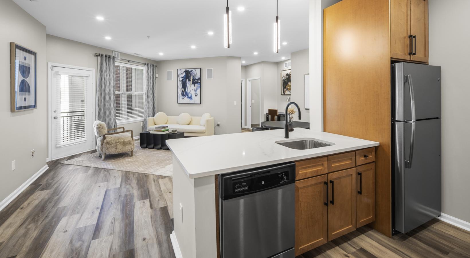 • a kitchen with wooden cabinets and stainless steel appliances
