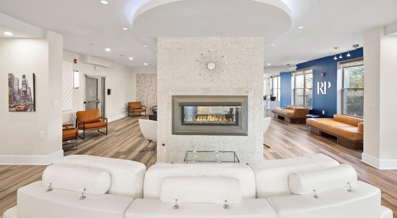 • a large room with a fireplace and large couch