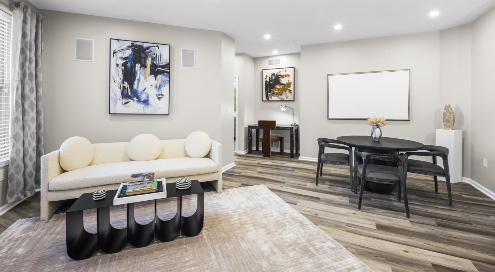 • a living room with a couch coffee table and table with chairs