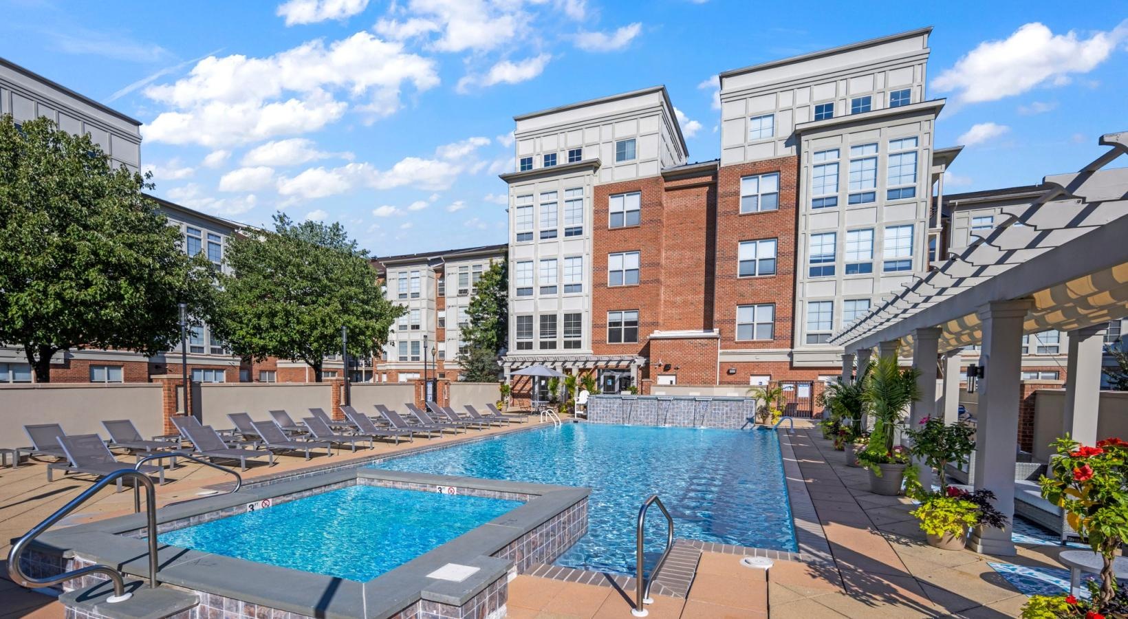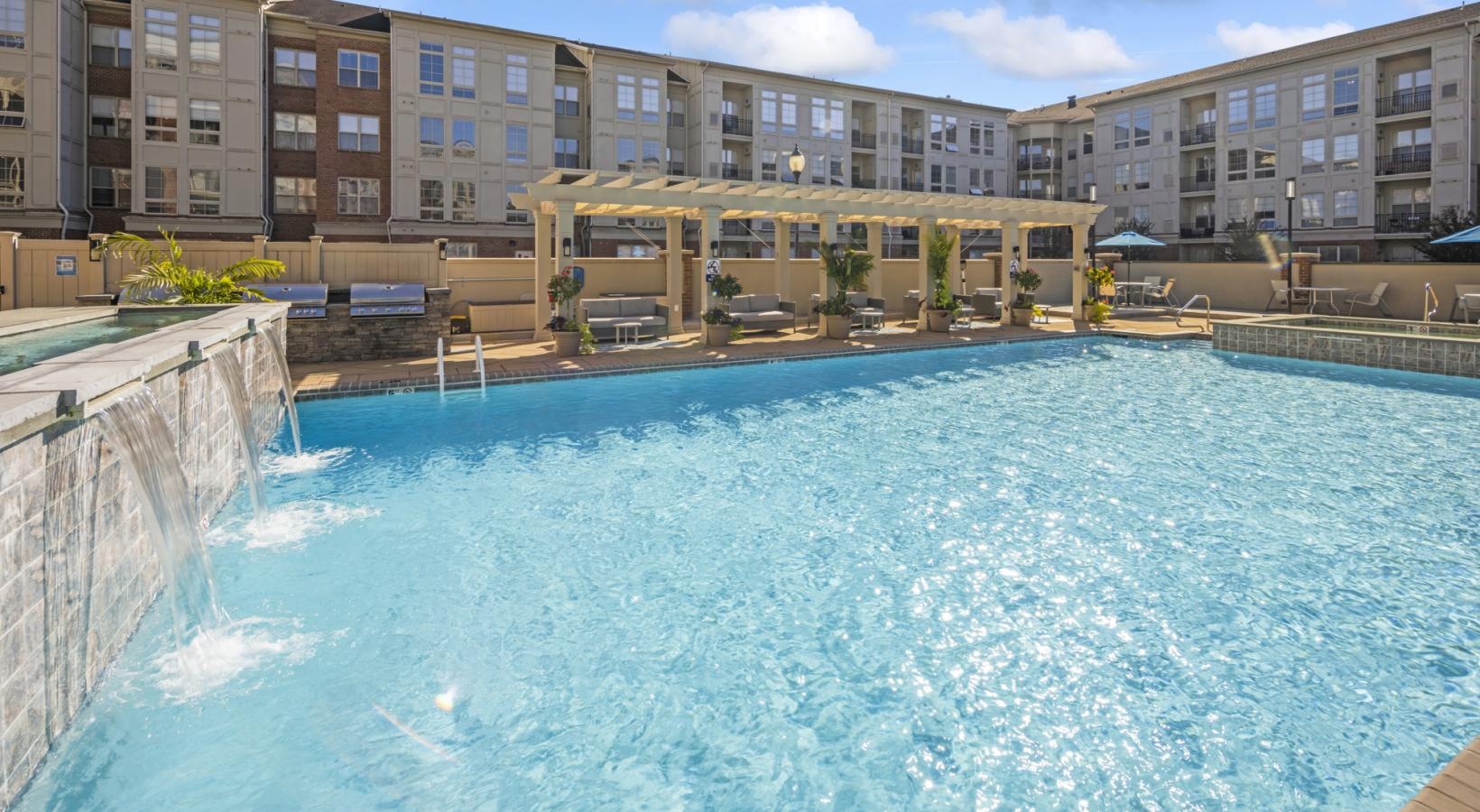 • a pool with a building in the background