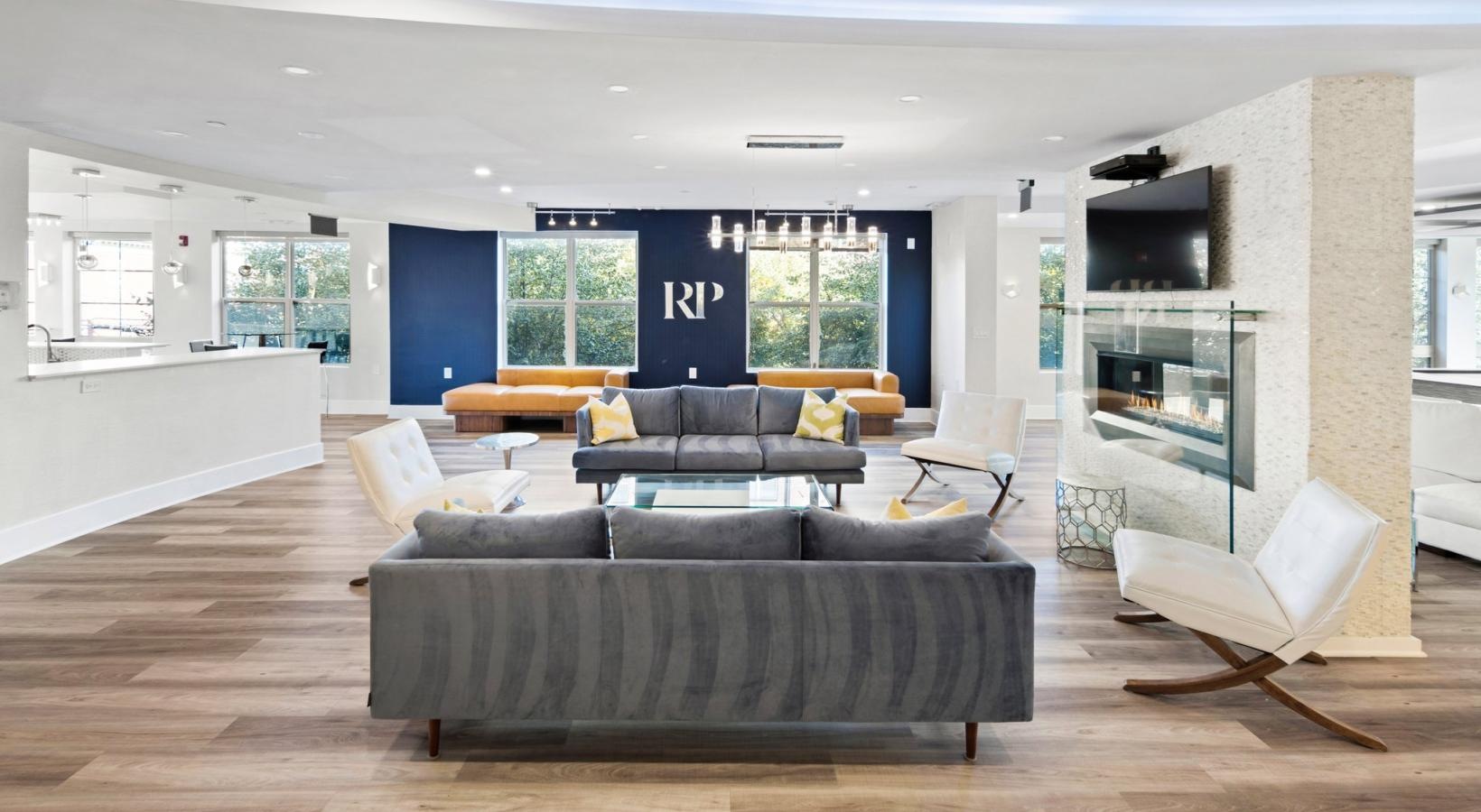 • a lounge with a large couch chairs fireplace and tv