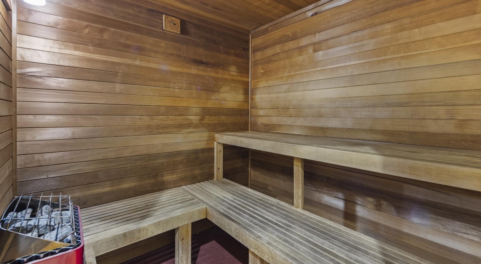 • a wooden bench in a sauna room