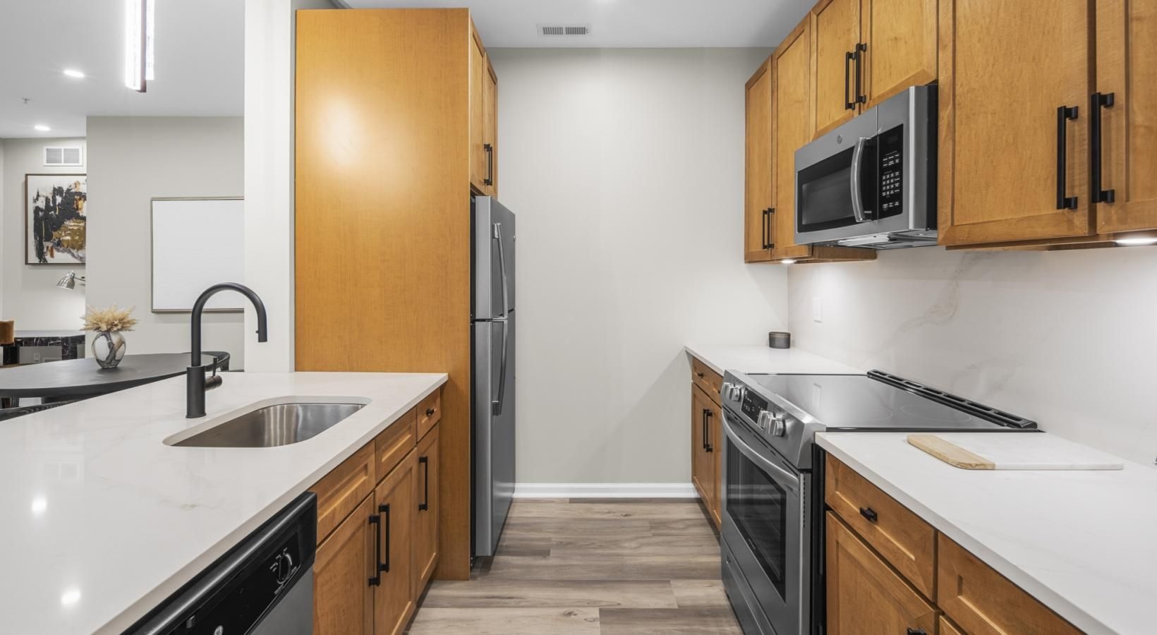 • a kitchen with wood cabinets and stainless steel appliances
