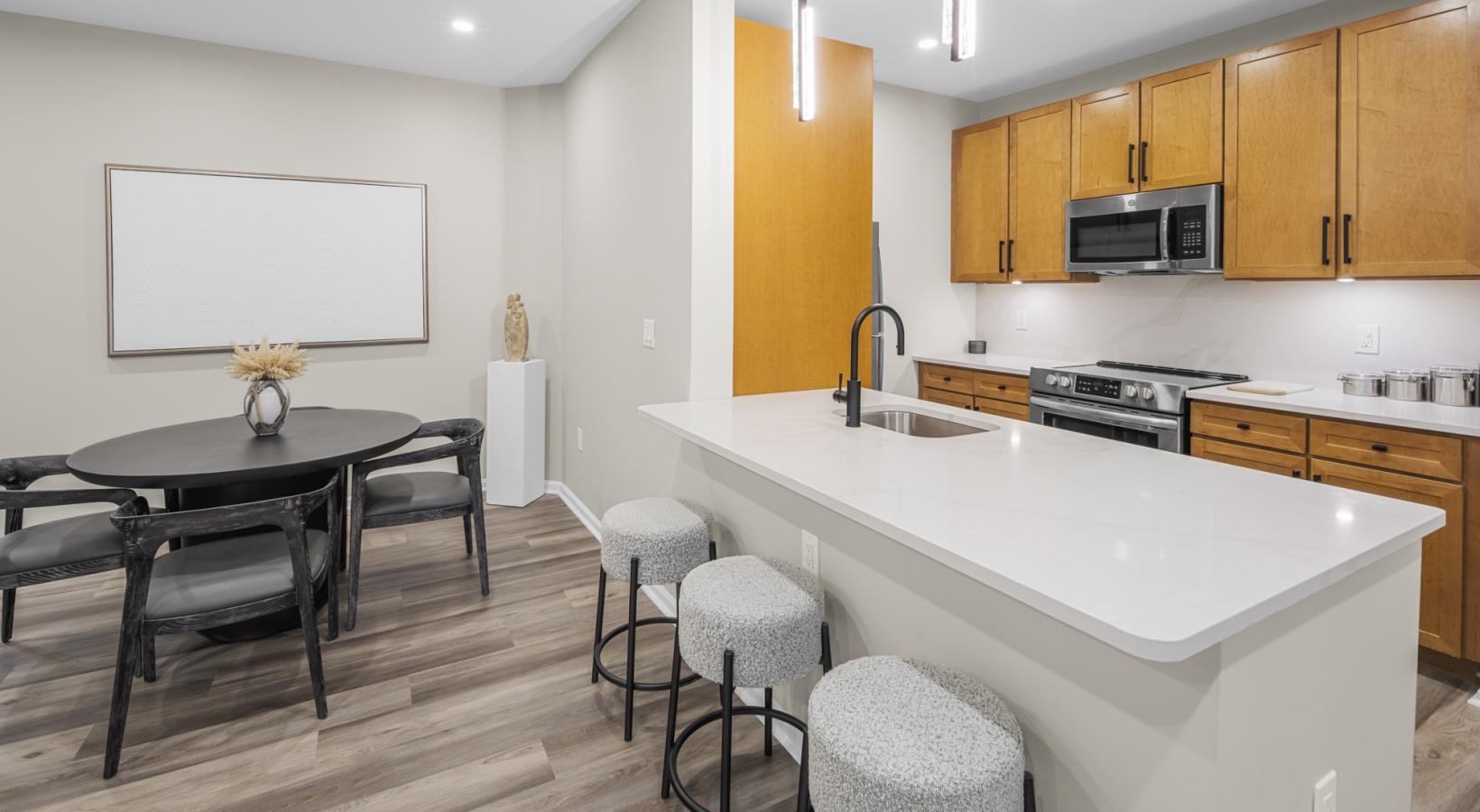• a kitchen with an island with seating and a table and chairs