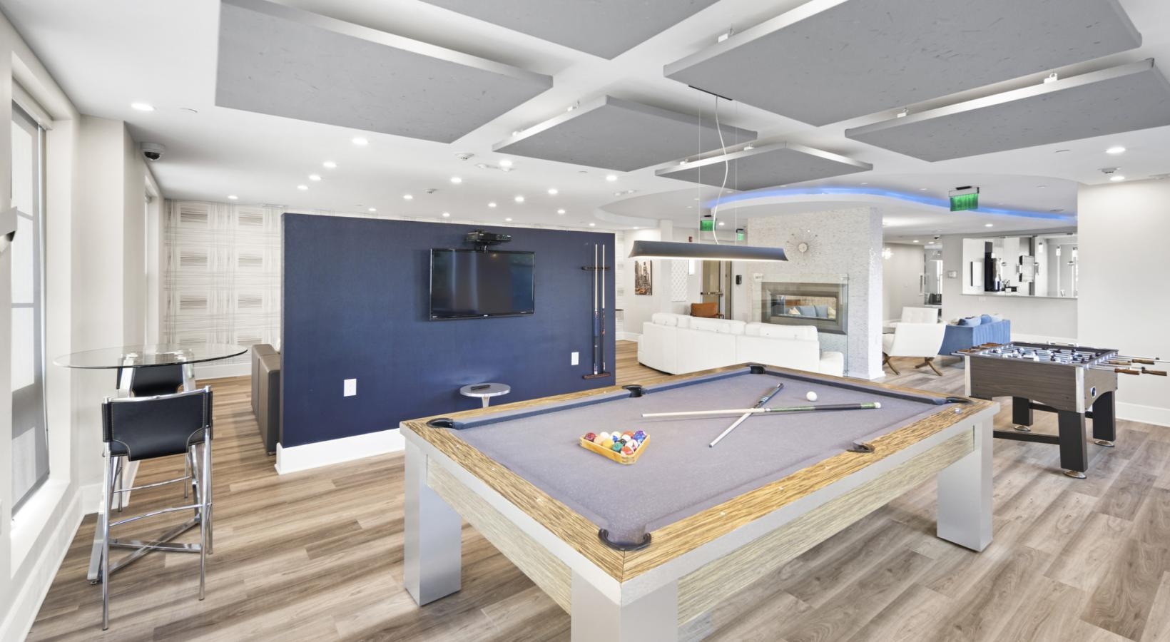 • a room with a pool table tv and chairs
