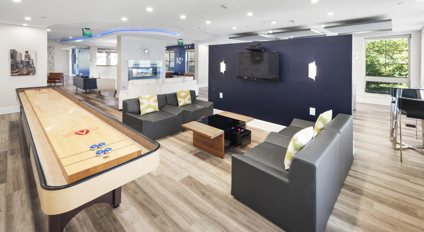 • a large room with black couches a tv and a shuffle board table