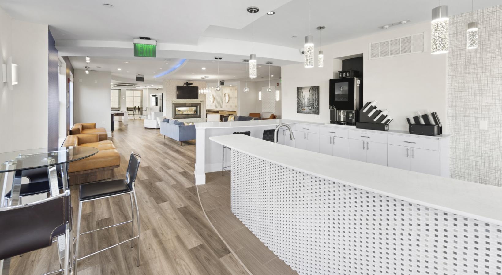 • a room with a table chairs and large bar